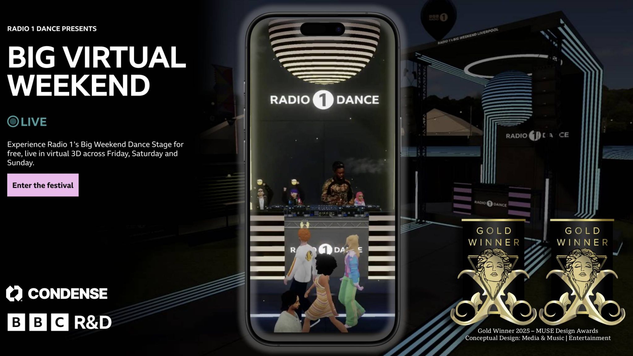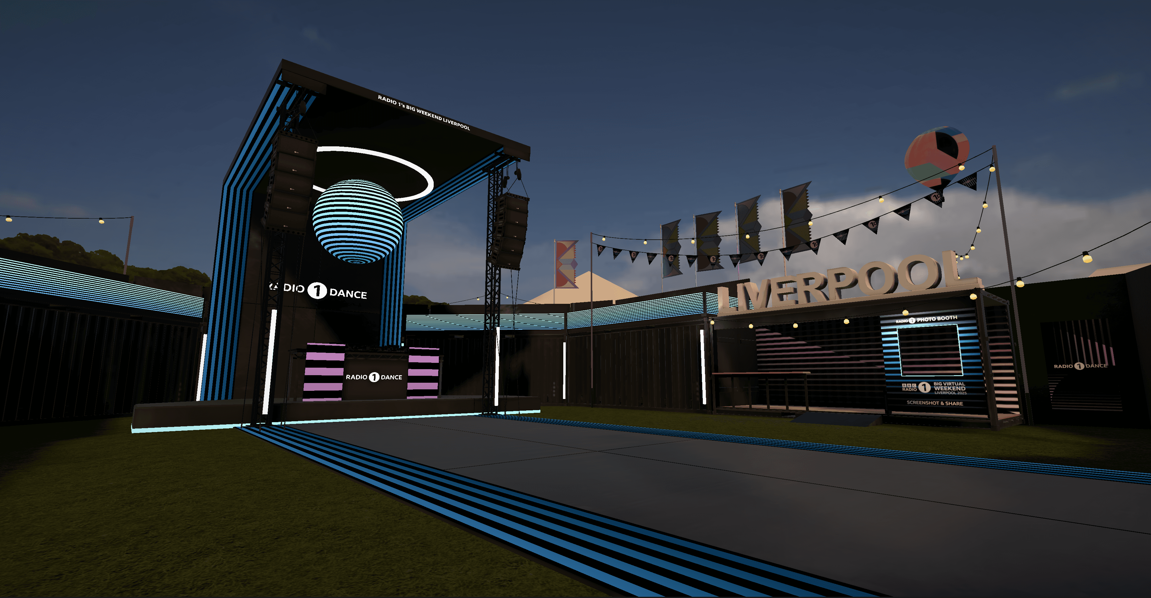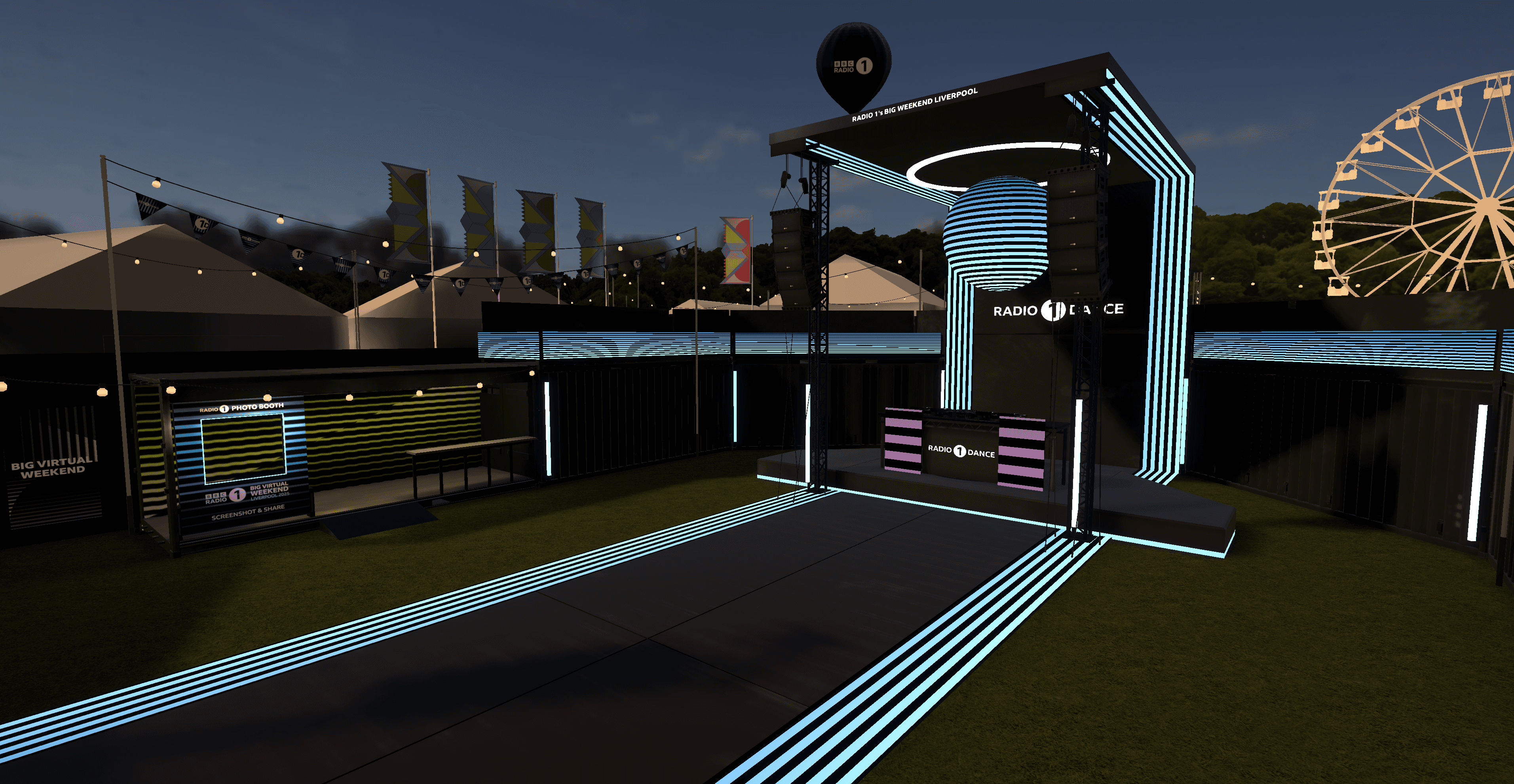 As part of BBC Radio 1’s Big Weekend festival, this project introduced a virtual extension of the live event — allowing users to attend the Radio 1 Dance Stage in real time through an interactive, web-based 3D environment. Designed to complement the physical festival, the virtual space offered fans a new way to engage with live performances, accessible from anywhere.